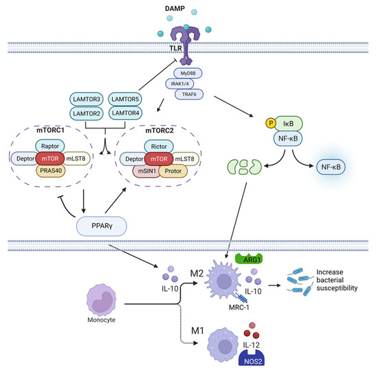Our immune system has evolved to self-regulate and protect the host from tissue damage through the induction of anti-inflammatory, wound healing, and re-modeling pathways. For instance, mTOR activation leads to the rapid upregulation of the negative regulator of inflammation, PPARγ, which in turn represses mTOR-activation [13], while also promoting anti-inflammatory pathways [23]. Similarly, NFκB-mediated transcription induces the upregulation of its negative regulator, IκB. While PPARγ also regulates the NFκB pathway through both physical interactions with NFκB, preventing its nuclear translocation, and active transcription of IκB [24] (Figure 8).