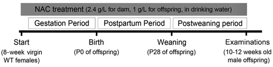 N-acetylcysteine (NAC; A7250, Sigma-Aldrich, St. Louis, MO, USA) was dissolved in the drinking water and given to the pregnant and lactating dams (2.4 g/L) and their post-weaning offspring (1 g/L) until the experiments were conducted. This protocol was chosen according to earlier studies [60,92]. In the vehicle group, regular drinking water was provided. Phenotypic examinations of the offspring were conducted at 2–3 months old.