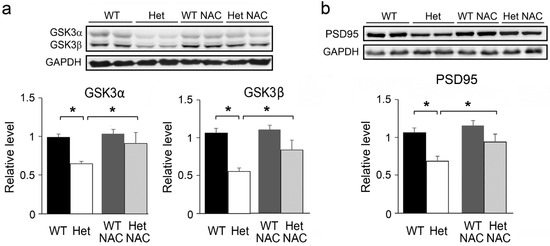 Glycogen synthase kinase 3 (GSK3) signaling is important for neural development. Altered GSK3 expression and associated signaling pathways have been linked with various mental disorders including schizophrenia [42,43]. The levels of two GSK3 forms (GSK3α and GSK3β) were decreased in the Het mice, indicating a pathological condition in the striatum of these mutants. Notably, the expression of GSK3s was increased in the Het mice by NAC treatment (Figure 4a). GSK3s are known to regulate the structure of dendritic spines via the mediation of actin cytoskeleton and postsynaptic scaffold proteins such as PSD95 [44,45]. As our previous study showed reduced PSD95 in the striatum of the Het Disc1 mice [30], we wondered whether NAC treatment could also rescue the expression of PSD95. Notably, without NAC treatment, the level of striatal PSD95 in the Het mice was lower than that in the WT controls, however, it was normalized by chronic NAC treatment (Figure 4b). In the WT mice, the expression of GSK3s and PSD95 was not affected by NAC treatment (Figure 4a,b).
