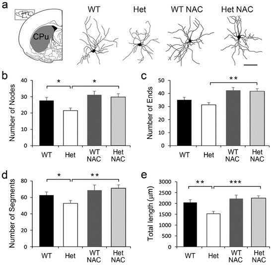 In our Het Disc1 mutants, along with increased striatal D2R level, we also observed a significant reduction in dendritic complexity and spine density in the striatal MSNs [30]. Since chronic NAC treatment brought the elevated striatal D2R level in the Het Disc1 mutant mice to the WT level (Figure 3b), we wondered whether the morphology of MSNs in Het mice could also be rescued by NAC. Golgi-stained striatal MSNs were then collected and reconstructed (Figure 5a). The morphometric features of striatal MSNs were characterized. Compared to the WT group, the dendritic complexity including the number of bifurcation nodes (Figure 5b) and dendritic segments (Figure 5d) as well as the dendritic length (Figure 5e) were reduced in the Het mice. Remarkably, all of these parameters in Het mice were corrected following NAC treatment (Figure 5b–e).