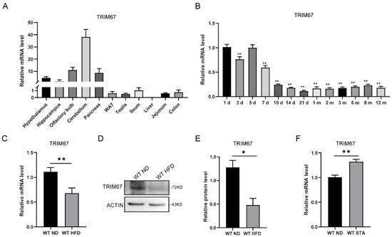 TRIM67 is responsive to energy homeostasis. (A) RT-qPCR analysis for the abundance of TRIM67 in different organs (n = 4). (B) The expression levels of TRIM67 in hypothalamus tissues from the different ages of WT mice (n = 4). (C) The expression of TRIM67 in hypothalamus of male mice after a 14-week high-fat diet (n = 4). (D) The protein level of TRIM67 in hypothalamus of male mice after a 14-week high-fat diet (n = 4). (E) The gray value statistical analysis of TRIM67 (n = 4). (F) The expression of TRIM67 in hypothalamus after 24 h starvation (n = 4). Four samples from each group were used for RT-qPCR analysis and two duplicate samples were measured. The data are presented as means ± SEM. * p-value < 0.05; ** p-value < 0.01.