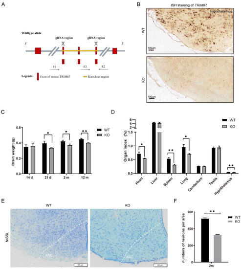 To further elucidate the function of TRIM67 in the hypothalamus, we generated a TRIM67 knockout mouse (TRIM67 KO) by knocking out exons 3 to 5 of the TRIM67 gene (Figure 2A). In situ hybridization (ISH) staining showed that TRIM67 was completely deleted in the hypothalamus (Figure 2B). The TRIM67 KO mice could be born with an expected Mendelian ratio and displayed normal postnatal viability. We found the weight of the brain was decreased in the TRIM67 KO mice (Figure 2C) and the organ index (organ index = organ weight/body weight ×100%) of the hypothalamus was also decreased compared with the WT mice (Figure 2D). To further reveal the effect of TRIM67 in the development of the hypothalamus at a morphologic level, NISSL staining was performed. We focused on the arcuate nucleus (ARC) of the mediobasal hypothalamus (MBH) because this region plays a key regulatory function in energy homeostasis []. We found the cell number of hypothalamic neurons was decreased in the TRIM67 KO mice (Figure 2E,F). The data above indicated that TRIM67 might regulate the normal development of the hypothalamus.