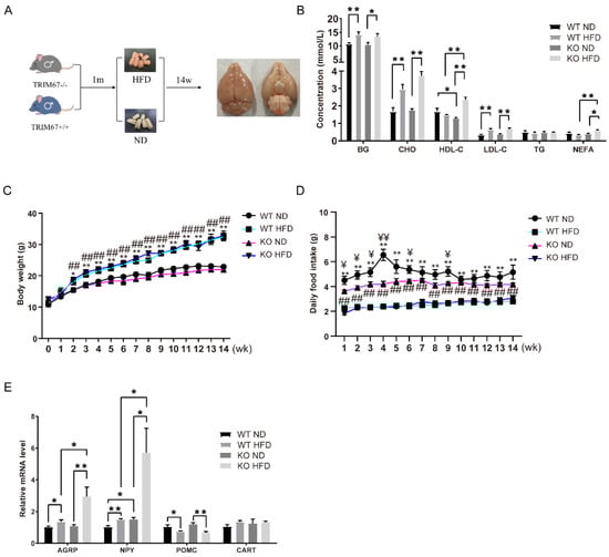 The hypothalamus plays a critical role in diet-induced obesity (DIO) []. To elucidate the role of TRIM67 in DIO, 1-month-old TRIM67 KO mice and WT mice were fed a high-fat diet for 14 weeks (Figure 3A). The blood glucose (BG), blood cholesterol (CHO), and low-density lipoprotein (LDL) were higher after a high-fat-diet feed, but there was no statistical difference between the TRIM67 KO and control mice (Figure 3B). No significant change in body weight was found between the WT and TRIM67 KO mice (Figure 3C). A slightly lower food intake was detected in the TRIM67 KO mice with a normal diet, but the same food intake in the WT and TRIM67 KO mice under HFD exposure suggested that deleting TRIM67 induced a greater food intake under HFD exposure (Figure 3D). Two functionally antagonistic neuronal populations in the arcuate nucleus of the hypothalamus (ARC) sense the energy state and allow for accurate feeding behavior regulation []. One subset of neurons expresses the orexigenic neuropeptides agouti-related peptide (AgRP) and neuropeptide Y (NPY); the other subset expresses the anorexigenic peptides proopiomelanocortin (POMC) and cocaine and amphetamine-regulated transcript (CART). Under HFD exposure, we found the mRNA levels of AgRP and NPY were increased in the TRIM67 KO mice compared with the WT mice (Figure 3D). Although the anorexigenic genes were decreased after a high-fat diet, no statistical difference was observed after a TRIM67 deficiency (Figure 3E). Thus, the data indicated that deleting TRIM67 specifically activated AgRP-expressing neurons in HFD-induced obese mice.