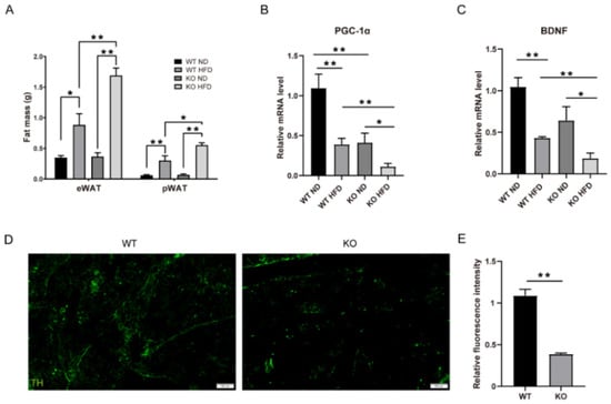 An imbalance between the energy in and the energy out can directly induce the excessive accumulation of fat []. We found that the fat masses of both the epididymal white adipose tissue (eWAT) and perirenal white adipose tissue (pWAT) in the TRIM67 KO mice were heavier than those in the WT mice under HFD exposure (Figure 4A). Consistent with the increased fat mass in the TRIM67 KO mice, a key transcription regulator gene, peroxisome proliferator-activated receptor γ coactivator 1α (PGC-1α)—which induces the expression of mitochondrial fatty acid oxidation and thermogenic genes in adipose tissue []—was significantly decreased in the adipose tissue of the TRIM67 KO mice (Figure 4B). This was not due to a TRIM67 deficiency in the adipose tissue of the TRIM67 KO mice because TRIM67 expresses little in adipose tissue (Figure 1A). Adipose tissue is innervated by the sympathetic nervous system (SNS) that regulates thermogenesis in brown adipose tissue (BAT) and lipolysis in WAT []. Recently, a sophisticated study showed that brain-derived neurotrophic factor (BDNF), which is expressed in the paraventricular nucleus of the hypothalamus, regulated the sympathetic innervation of subcutaneous white and brown adipose tissue []. We hypothesized that a reduced BDNF might account for the accumulation of fat in the TRIM67 KO mice. An RT-qPCR assay showed that the mRNA of BDNF was reduced in the hypothalamus of the TRIM67 KO mice (Figure 4C). Furthermore, immunostaining with tyrosine hydroxylase (TH), which was used to mark SNS neurons, showed a significant decrease in the SNS innervation of BAT in the TRIM67 KO mice (Figure 4D,E). Therefore, the data above suggested that a TRIM67 deficiency in the hypothalamus induced fat accumulation via the BDNF–SNS axis.