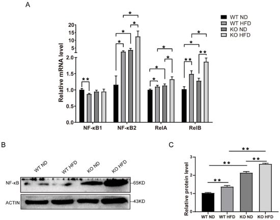 The transcription factor NF-κB is a key regulator of immunity and can induce the expression of pro-inflammatory cytokines in both microglia cells and astrocytes [,]. We further investigated a possible connection between the NF-κB pathway and the dysregulation of the energy balance in the hypothalamus. The NF-κB family of transcription factors, NF-κB2 (p52), RelA, and RelB, were increased in the mRNA levels of the TRIM67 KO mice compared with the controls (Figure 6A). The Western blots also revealed an increase in the NF-κB of the TRIM67 KO mice (Figure 6B,C). Thus, the data demonstrated that TRIM67 deletion increased hypothalamic inflammation by activating the NF-κB pathway under HFD exposure.