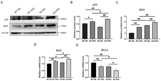 As the inflammatory signal can lead to the activation of apoptotic signaling pathways [], we evaluated the effect of TRIM67 deletion on the induction of apoptosis in the hypothalamus under HFD exposure. The tumor suppressor protein P53 triggers cell apoptosis. We found that P53 was increased in the TRIM67 KO mice under HFD exposure assayed by Western blots (Figure 7A,B). P53 can regulate the transcription of pro-apoptotic protein BAX; we found that BAX was increased in the protein and mRNA levels of the TRIM67 KO mice (Figure 7A,C,D). In contrast, the expression of anti-apoptotic protein BCL2 was decreased in the TRIM67 KO mice compared with the control mice (Figure 7E). Combined with the decreased number of hypothalamic neurons we observed before (Figure 2D,E), the data suggested that a TRIM67 deficiency could induce a higher level of apoptosis in the hypothalamus under HFD exposure.