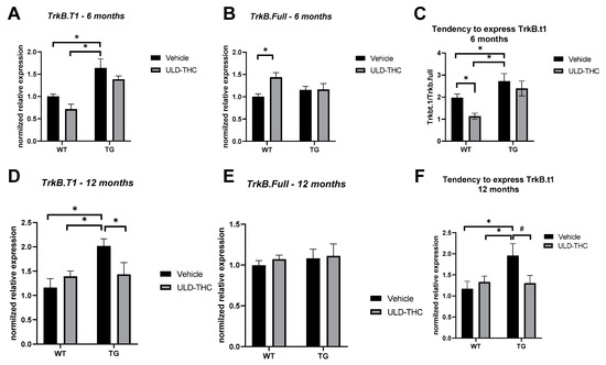 TrkB Neurotropic receptor imbalance. Six-month-old AD mice displayed higher TrkB.T1 expression in RT-PCR compared to WT mice, while no such upregulation was observed between the AD mice (A). There was no difference in the gene expression levels of TrkB-full receptor between AD mice and WT mice, although we did see an upregulation in the ULD-THC-treated WT mice compared to the non-treated WT mice (B). Non-treated AD mice had a higher ratio of expressed TrkB.T1: TrkB-full compared to WT mice, while no such tendency was observed in treated AD mice (C). 12-month-old AD mice displayed higher TrkB.T1 expression compared to WT mice, while no such upregulation was observed between the treated AD mice (D). There was no difference in the gene expression levels of TrkB-full receptor between AD mice and WT mice, although we did see an upregulation in the ULD-THC-treated WT mice compared to the non-treated WT mice (E). Non-treated AD mice had a higher ratio of expressed TrkB.T1: TrkB-full compared to WT mice, while no such tendency was observed in treated AD mice (F). * indicates p > 0.05. # indicates p = 0.08 Mean ± SEM.