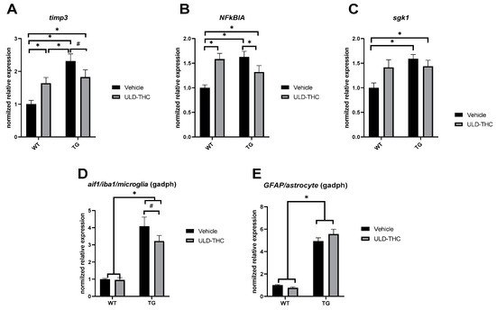 It should be noted that WT mice treated with ULD-THC exhibited some heightened expression of inflammatory related-genes compared to untreated WT mice. This is in accordance with the notion of the dual-effect of ULD-THC; where ULD-THC given to young and healthy mice demonstrates cognitive decline [54], whereas in aged or neurologically impaired mice, ULD-THC shows beneficial effects [23,24]. This age-dependent dual effect of low doses of THC was suggested to be related to CB1 activation, histone acetylation, as well as to the expression of BDNF and TrkB [28] (for an extensive review, see [42,55,56]).