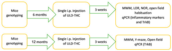 Cannabinoids are emerging as promising therapeutic agents for AD [4]. ∆9-tetrahydrocannabinol (THC), which is the major psychoactive constituent of the cannabis plant, potentially affects many of the factors involved in AD pathologies, such as Aβ clearance, mitochondrial function, inflammation, and neurogenesis [5,6]. Indeed, in vitro, THC decreases Aβ concentration in a dose-dependent manner in N2a/APPswe cells [7]. In vivo, treatment with THC reduces the Aβ burden in 5XFAD/APP mice [8] and reduces neuronal loss and restores cerebral glucose metabolism in the hippocampus of a mouse model of sporadic AD [9]. Activating the receptor of THC, which is the cannabinoid receptor (CBR), results in the removal of Aβ deposits in vitro [10] and, in vivo, improves tau and amyloid pathology in a mouse model of tauopathy [11], affects the oxidative stress response in an APP/PS1 mice model of AD, and reduces cognitive deficits in mouse and rat AD models [12,13,14,15]. However, all these studies used chronic treatments, mostly with conventional (high) doses of cannabinoid agonists (1–20 mg/kg), which can have deleterious effects [16,17]. Other than the psychoactive effect, THC exposure in young adults is correlated to deficits in attention [18], short-term memory [19], and spatial memory [20]. Therefore, a major question in the field is whether an ultra-low dose of THC (ULD-THC) can effectively treat AD while sidestepping unwanted side effects.
