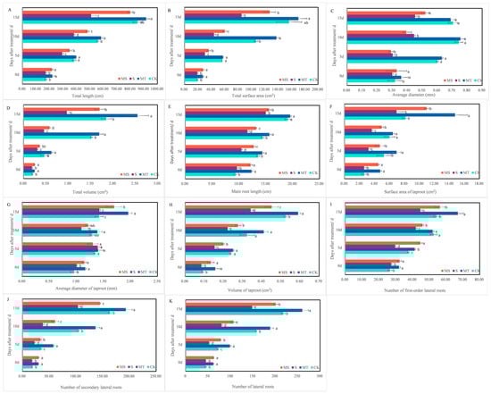 Effects of melatonin on cotton root morphology across treatment times. The upper parts of cotton seedlings and their root systems after treatment with control conditions (CK), melatonin (MT), NaCl (S) and both melatonin and NaCl (MS) for 15 d. (A) total length; (B) total surface area; (C) average diameter; (D) total volume; (E) main root length; (F) surface area of taproot; (G) average diameter of taproot; (H) volume of taproot; (I): number of first-order lateral roots; (J) number of secondary lateral roots; (K) number of lateral roots. Different lowercase letters indicate significant differences among treatments at the same timepoint (p < 0.05).
