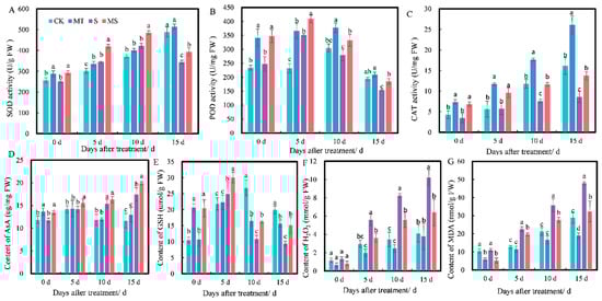 Non-enzymatic antioxidant substances (e.g., AsA and GSH) can scavenge free radicals and resist the negative effects of free radicals, so they can be used as an indicator of the ability of plants to respond to radicals. As shown in Figure 3D,E, at 0 d, the AsA and GSH contents under MT and MS treatments were significantly higher than those under CK and S treatments. At 5 d, there was no significant difference in AsA content between MT and CK treatments (p < 0.05). The AsA and GSH contents under MS treatment were significantly higher than those under S treatment. At 10 d, there was no significant difference in AsA content between MT and CK treatments (p < 0.05). The AsA content under S treatment was significantly higher than that under CK treatment (p < 0.05). The GSH content under MS treatment was higher than that under S treatment. At 15 d, there was no significant difference in AsA content between MT and CK treatments. The AsA content under S treatment was significantly higher than that under CK treatment, the GSH content under S treatment was significantly lower than that under MS treatment and the GSH content under MS treatment was significantly higher than that under S treatment (p < 0.05).