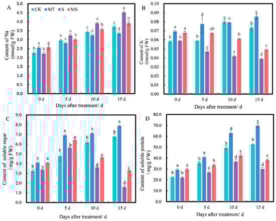 Osmotic regulation substances can alleviate osmotic damage to plant cells caused by salt stress. The trends in inorganic osmotic substances Na+ (Figure 4A) and K+ (Figure 4B) differed. At 0 d, the content of Na+ under MT and MS treatments was significantly higher than that under CK and S treatments; there was no significant difference between MT and MS treatments, and no significant difference between CK and S treatments. As treatment time increased to 5 d, the Na+ content under MT treatment was significantly lower than under CK treatment, the Na+ content under S treatment was significantly higher than under CK treatment and the Na+ content under MS treatment was significantly lower than under S treatment (p < 0.05). At 0 d, the content of K+ under MT and MS treatments was significantly higher than that under CK and S treatments. From 5 to 15 d, the K+ content under S and MS treatments gradually decreased with time. The K+ content under MT treatment was significantly higher than under CK treatment. Additionally, the K+ content under S treatment was significantly lower than under CK treatment, and the K+ content under MS treatment was significantly higher than that under S treatment (p < 0.05).