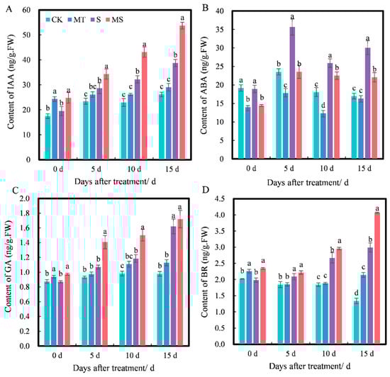 Effects of exogenous melatonin on (A) auxin (IAA), (B) abscisic acid (ABA), (C) gibberellin (GA) and (D) brassinosteroid (BR) contents of cotton seedling roots under salt stress. Different lowercase letters indicate significant differences among treatments at the same timepoint (p < 0.05). CK, control treatment; MT, melatonin treatment; S, NaCl treatment; MS, combined melatonin and NaCl treatment.