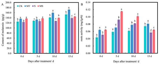 Effects of exogenous melatonin on (A) endogenous melatonin contents and (B) root activity of cotton seedling roots under salt stress. Different lowercase letters indicate significant differences among treatments at each timepoint (p < 0.05). CK, control treatment; MT, melatonin treatment; S, NaCl treatment; MS, combined melatonin and NaCl treatment.