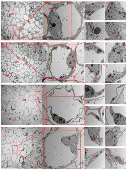 Effects of melatonin on root cortex cell ultrastructure of cotton seedlings under salt stress. (A–F) Transmission electron micrograph (TEM) of the cortex cell structure under control (CK) treatment; (G–L) TEM of the cortex cell structure under melatonin (MT) treatment; (M–R) TEM of the cortex cell structure under NaCl (S) treatment; (S–X) TEM of the cortex cell structure under the combined melatonin and NaCl (MS) treatment. ep, epidermis; cor, cortex; st, stele; m, mitochondrion; e, endoplasmic reticulum; d, dictyosome; c, cell nucleus; v, vacuole.