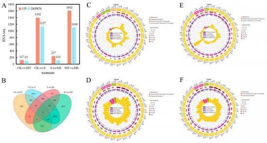 By comparing the RNA-seq data between the treatment groups, i.e., S vs. CK, MT vs. CK, MS vs. S and MS vs. MT (Figure 8), log2 (fold change (FC)) and p < 0.05 thresholds were applied as the standard for identifying differentially expressed genes, and statistical methods were used to analyze the differentially expressed genes under different treatments. As shown in Figure 8A, compared with CK treatment, a total of 2519 genes were differentially expressed under S treatment, including 1392 up-regulated genes and 1127 down-regulated genes. Compared with CK treatment, MT treatment induced a total of 214 differentially expressed genes, including 117 up-regulated genes and 97 down-regulated genes. Compared with S treatment, a total of 347 differentially expressed genes were observed under MS treatment, including 237 up-regulated genes and 110 down-regulated genes. Compared with MS treatment, there were 2701 differentially expressed genes under MT treatment, including 1602 up-regulated genes and 1099 down-regulated genes. As shown in Figure 8B, 888 genes were differentially expressed in both the CK vs. S and S vs. MS comparisons, and 5997 and 976 genes were uniquely expressed under the S and MS treatments, respectively. There were 442 genes uniquely expressed in both the CK vs. MT and MT vs. MS comparisons, and 6399 and 534 genes were uniquely expressed in the MS and CK treatments, respectively. In the comparisons among treatments, the number of up-regulated genes was higher than that of down-regulated genes.