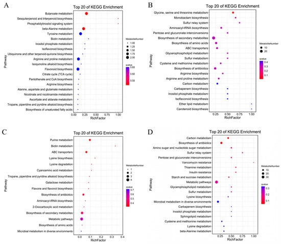 Differential metabolite enrichment bubble diagram of cotton seedling roots under (A) CK vs. MT, (B) CK vs. S, (C) S vs. MS and (D) MT vs. MS treatments. Note: KEGG, Kyoto Encyclopedia of Genes and Genomes; CK, control treatment; MT, melatonin treatment; S, NaCl treatment; MS, combined melatonin and NaCl treatment.