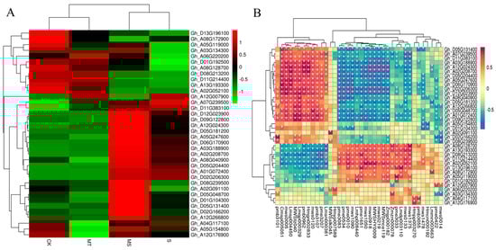 Based on the KEGG analysis, we analyzed the DEGs related to ROS clearance, plant hormone signal transduction, melatonin synthesis and substance transport (Figure 10A), revealing that six DEGs were related to ROS clearance. Three of these were associated with the POD pathway (Gh_A12G007900, Gh_A05G154800, Gh_A12G176900) and two with the CAT pathway (Gh_A02G208700, Gh_D01G104300), while the remaining one was associated with the GSH pathway (Gh_A04G117100). Twenty DEGs were associated with plant hormone signal transduction and specifically associated with five subpathways, including eight DEGs associated with the auxin subpathway, two with the CTK (cytokinin) subpathway, four with the GA subpathway, four with the ABA subpathway and two with the brassinosteroid (BR) pathway. The analysis of the S vs. MS comparison showed that the auxin protein gene Aux/IAA, auxin small RNA gene SAUR and auxin response gene GH3 responded to auxin during auxin signal transduction, and four auxin protein genes (Aux/IAAs) were significantly up-regulated. Two genes encoding SAUR and two encoding GH3 were down-regulated. For the CTK pathway, both up- and down-regulated DEGs genes included cytokinin receptor (AHK) genes. For GA signal genes, MT treatment up-regulated two genes encoding GA receptor (GID1). For ABA signaling, four genes were up-regulated, mainly encoding ABA response element binding factor (ABF). For BR signaling, MT treatment induced the up-regulation of two genes encoding Br-associated receptor kinase (BZR). In addition to hormone signal transduction, six genes related to melatonin and tryptophan synthesis were up-regulated (Gh_A08G128700, Gh_A12G266800, Gh_D08G239500, Gh_D09G122800, Gh_A02G091100 and Gh_D06G170900). Four genes encoding ABC transporters (Gh_A07G239500, Gh_A08G172900, Gh_D11G383100 and Gh_A02G052100) were up-regulated.