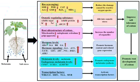 Based on the results of the present study, we developed a simplified model to describe the effect of exogenous melatonin on roots under salt stress. As shown in Figure 11, exogenous melatonin can promote increases in SOD, CAT and POD activities and AsA and GSH contents in the roots of cotton seedlings under salt stress, which leads to a decrease in the accumulation of H2O2 and MDA. Melatonin can also promote the production of soluble sugar, soluble protein and K+ and reduce the accumulation of Na+. Exogenous melatonin also promoted both endogenous melatonin content and root activity as well as the synthesis of IAA, GA and BR. The melatonin treatment also reduced the accumulation of ABA and induced the expression of various genes and transcription factors, such as WRKY, ERF, MYB and TGA. The application of melatonin can improve the expression of endogenous melatonin-related genes and thus the level of melatonin, resulting in a close arrangement of cotton root cells and an increase in the number of organelles such as mitochondria and Golgi apparatus and endoplasmic reticulum organelles. Exogenous melatonin can significantly enrich metabolites associated with carbon metabolism; antioxidant synthesis; amino acid, sugar and nucleotide sugar metabolism; starch and sucrose metabolism; glycerophospholipid metabolism and sphingolipid metabolism pathways. Thus, exogenous melatonin can alleviate salt stress in cotton roots by improving the activity of antioxidant enzymes, promoting the synthesis of osmotic regulatory substances, activating transcription factors and coordinating complex hormone signal transduction pathways and hormone synthesis. In general, exogenous melatonin can improve the salt tolerance of cotton seedlings by regulating their root physiology, cell structure and gene expression under salt stress.