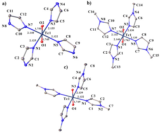In the work of Fackler and co-workers in 1985 [1], the structure of [TcO2(Im)4]Cl·2H2O (Im = imidazole) was analyzed. The Tc=O distances were used in some of the databases as a reference for TcO2+, giving an idea of the large variation of Tc=O in technetyl cation—the observation being in fact erroneous, due to the initial misinterpretation of the space group in the compound structure. Meanwhile, the great interest in the technetyl(V) derivatives arose due to the fact that its application in nuclear medicine as biologically active 99mTc radiopharmaceuticals is based on the Tc(V) formation with [O=Tc=O]+ as a complex-forming center [23,24,25,26]. The Tc complexes of such a type with amine and imine ligands are the principal models for the Tc bonding to amino acids, proteins, antibodies etc. In general, Tc (V) usually forms trans -[O2L4Tc]+, where L is the N-bearing organic ligand [17]. Imidazole rings are often found in biochemical systems applicable to metal coordination.