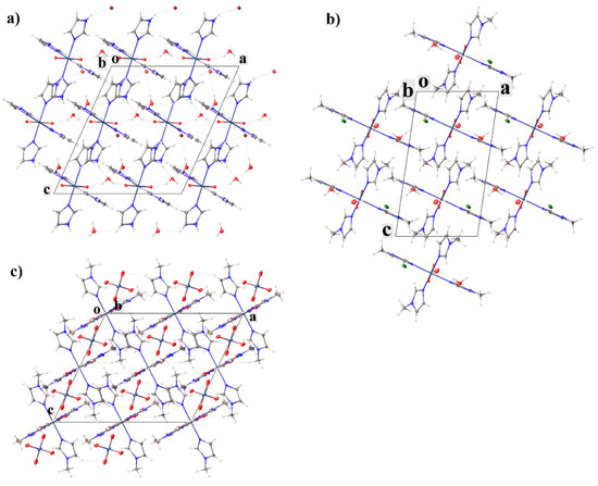 Crystal packing of II (a), III (b) and IV (c) showing layers of complexes with solvent molecules and counterions between them. View along b axis.