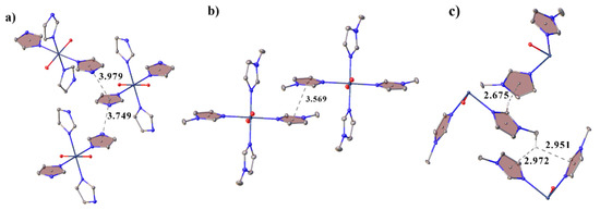 In all of the structures, the cations are bonded to each other through crystallization water molecules or counterions. In II, the cations are linked through bromide-ions by the H-bonds of the N–H···Br type and through the water molecules by the hydrogen bonds of the N–H···O and O–H···O types. In III, the cations are linked to the water molecules by the hydrogen bonds of the O–H···O type, which in turn form a water···Cl···water···water bridge to another cation. In IV, the cations are linked to each other through the pertechnetate anions by the weak hydrogen bonds of the C–H···O type. The crystal packing in all of the complexes can be represented as layered, where the molecules of the complexes form layers, between which there are molecules of anions and water (Figure 2). Additionally, the molecules of the complexes in structure II are connected by two π–stacking interactions, and in III by only one (Figure 3a,b). The strongest π–stacking interaction is observed in structure III (Table 1). In structure IV, there are short distances between the atoms of the imidazole rings, but these contacts cannot be called π–stacking [28,29], because of the large distance between the centers (4.127 Å) and the large displacement (1.944 Å) of the rings. However, in IV, the methyl hydrogen of methylimidazole and one of the hydrogens of the imidazole ring participate in the CH-π interactions (the distances between the hydrogen atoms and the centers of the aromatic rings are shorter than 3 Å(Figure 3c)) [30,31,32,33]. In this case, the distance between the hydrogen atom and the center of the aromatic ring is the shortest in the case of the hydrogen of the imidazole ring. Although the CH-π interactions are often considered weaker than the hydrogen bonds, they are one of the factors that determine the molecular structure within a crystal and can be used for recognition [34,35].