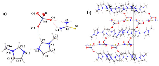 Compound V was obtained as a by-product of the preparation of compound IV. The structure contains two MeIm molecules, one of which is protonated at the nitrogen atom, but the proton in the compound is disordered between the two nitrogen atoms of different molecules (N3 and N13). The structure contains a neutral thiourea molecule and a pertechnetate-anion (Figure 4a). The MeIm fragments are in the same plane (the angle between the planes is 4.67°). The crystal packing can be represented as layered, the MeIm fragments are linked to each other by a hydrogen bond of the N–H···H type into dimers and by π–stacking interaction (Table 2) into layers, as in II–IV, and the pertechnetate-ions and thiourea molecules are located between the layers (Figure 4b). The thiourea molecules are linked to each other by the hydrogen bonds of the N–H···S type, to the pertechnetate-ions by H-bonds of the N–H···O type and to the imidazole fragments by the bonds of the C–H···S type.
