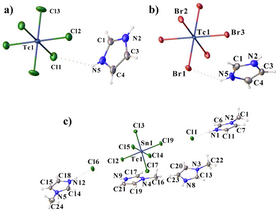 Compounds VI, VII and VIII are by-products of the second method. Compounds VI and VII contain protonated imidazole cations and hexahalide Tc(IV) anions (Figure 5). Compound VIII is a mixed salt containing 30% technetium and 70% tin in the hexahalide anion. In VIII, the asymmetric fragment contains four MeIm cations, the hexahalide anion and two chloride anions. The environment of the technetium or tin atoms in the hexahalide anions is close to an ideal octahedral (Tables S18, S23 and S27, Supplementary Materials).