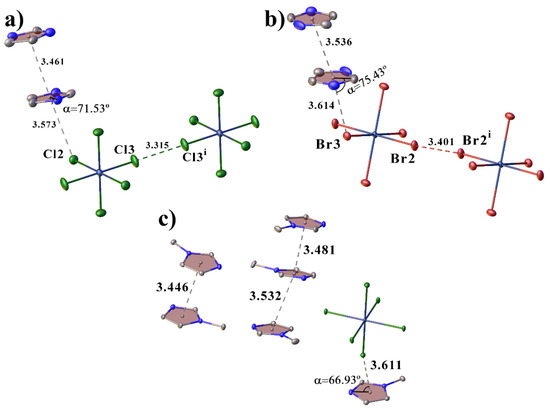 In addition, in VI–VIII there are anion–π interactions (the distance between the center of the ring and the anion is less than 5 Å, and the angle α is greater than 50°) between the hexahalide anions and imidazole rings (Figure 6) [36,37].