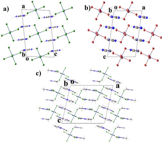 In structures VI–VIII, there are π–stacking interactions between cations (Table 2) (Figure 6). The crystal packing can be represented as layered. The cations in VI–VIII are linked into layers by the π–stacking interactions, the cations and anions are linked between layers by hydrogen bonds (Figure 7). In VI and VII, the anions are additionally linked by the halogen bonds, and the Hal···Hal. The packing of VI and VII is very close (Figure 7), the main difference is in the small rotations of anions and cations: in VI (sp. gr. C2/m), the anions occupy a special position with symmetry 2/m, and cations occupy a special position with symmetry m; in VII (sp. gr. P21/c), the anions occupy a special position with symmetry -1, and the cations are in a general position.