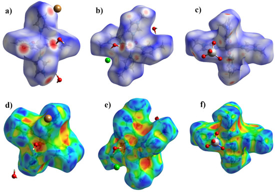 The Crystal Explorer 21 [45] program was used to analyze the non-valent interactions in crystals using the HS analysis. The donor–acceptor groups are visualized using a standard (high) surface resolution and dnorm surfaces (Figure 8a–c). The red spots on the surface of the dnorm plot indicate intermolecular contacts involving the hydrogen bonds. The brightest red spots correspond to the strongest hydrogen bond N—H···Hal in II–III and O–H···O in II. The weaker red spots correspond to C—H···Hal bonds in II–III, C—H···O in II–IV and the π–stacking interactions in II–III. For an additional analysis of the π–stacking interactions, the shape-index surfaces were described. There are π–stacking interactions in II and III, as seen from the characteristic red and blue triangles on the surface, and absent in IV (Figure 8d–f).