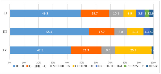 Percentage contributions to the Hirshfeld surface area for the various close intermolecular contacts for II–IV.