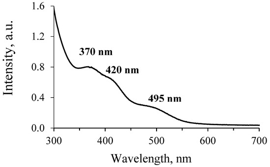 As no sulfur atoms are present in our case, compound II, the group [O=Tc=O]+ is completely characterized with the fluctuation bands at 790–880 cm−1 in the infrared region [46,47,48]. In the IR spectrum of II (Figure 10) the Tc=O group is pronounced by the bands at 809.79 cm−1 and 847.68 cm−1 (Table 2). A wide wave in the range of 2800–3700 cm−1 corresponds to the vibrations of water atoms [49] and 1500 ± 50 cm−1 scissor vibrations HOH. The remaining peaks displayed on the spectrum, including those that appear in the region of 2800–3700 cm−1, correspond to the vibrations of the carbon and nitrogen atoms in the imidazole fragment of the compound molecule II [50,51]. The spectra show the peaks splitting typical for compressed tablets KBr.