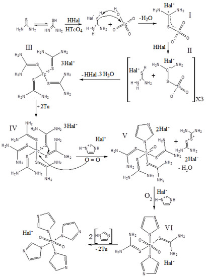 The reduction of the pertechnetate ion and the formation of the complexes apparently occur during the successive reduction of Tc(VII) to Tc(III) and the subsequent oxidation with atmospheric oxygen to Tc(V). The reaction takes place in the presence of catalytic anions in an acidic medium, in which the thiol tautomeric form of thiourea is stable. The reaction begins with the SH-group reaction with the Tc-O– bond; in this case, the Tc-S bond is formed with the formation of particle I and the water molecule elimination. The redistribution of the charges in an acid medium leads to an elongation of the Tc=O bond and the formation of particle II. Repeating this process three times results in the formation of particle III. The resulting fragment is reactive and coordinates with the two additional ligands, which can be assumed to contain thiourea, in the case of thiourea excess. The resulting particle IV presumably has an octahedral environment of the technetium atom [TcS6]. In the presence of the imidazolium fragment, it is possible for a slow stage of fragment IV oxidation. The oxidation, most likely with dissolved oxygen, leads to the sequential elimination of two thiourea molecules, which leave as a Tu22+ dimer, and the formation of a V particle. The repeated course of the reaction of oxidation and the substitution of two molecules of the Tu leads to the formation of particle VI. The resulting particle VI coordinates with the two imidazole molecules and completes the coordination sphere, forming a stable reaction product [TcO2(Im)4]+.