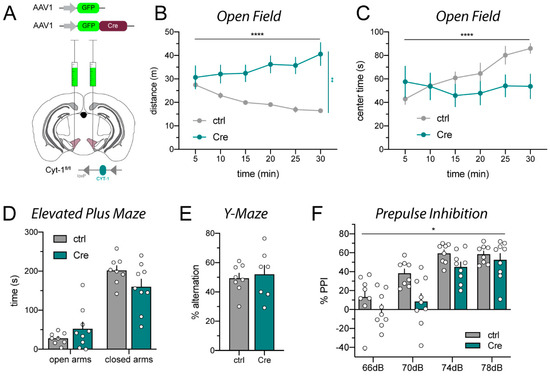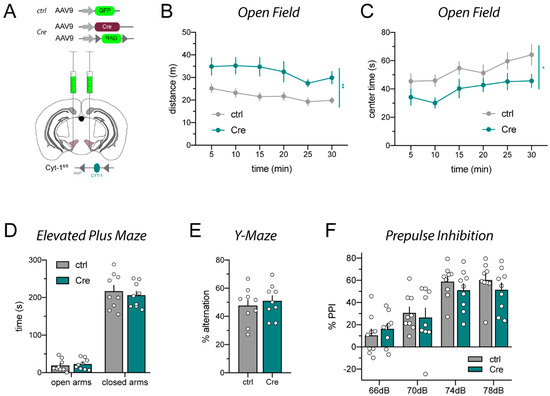 AAV9_Cre injections into the VTA of ErbB4 Cyt-1fl/fl mice cause hyperactivity relative to AAV9-injected ErbB4 Cyt-1fl/fl controls expressing GFP. (A) Scheme visualizing bilateral injection of AAV9_Cre/AAV9_DIO-GFP (Cre) and control AAV9_GFP (both 1013 GC/mL, for details see Figure S1) into the VTA of adult ErbB4 Cyt-1fl/fl mice. (B) AAV9_Cre-injected mice become hyperactive compared to control-injected mice in the open field (ctrl n = 9, Cre n = 9; mixed-effects model, F(5,77) = 0.6211, p = 0.6841 and genotype: p = 0.0083 **) and spent less time in the center of the maze ((C); ctrl n = 9, Cre n = 9; two-way ANOVA, F(5,80) = 0.4144, p = 0.8374 and genotype: p = 0.0327 *). (D) Anxiety measured in the elevated plus maze (ctrl n = 9, Cre n = 9; two-way ANOVA, F(1,16) = 0.3410, p = 0.5674 and genotype: p = 0.6416). (E) Spontaneous alternation in the Y-maze (ctrl n = 9, Cre n = 9; unpaired t-test, p = 0.5718). (F) Prepulse inhibition did not differ between groups (ctrl n = 9, Cre n = 9; two-way ANOVA, F(3,48) = 1.431, genotype: p = 0.6086).