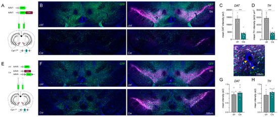 - Rezai Amin, S.; Gruszczynski, C.; Guiard, B.P.; Callebert, J.; Launay, J.M.; Louis, F.; Betancur, C.; Vialou, V.; Gautron, S. Viral vector-mediated Cre recombinase expression in substantia nigra induces lesions of the nigrostriatal pathway associated with perturbations of dopamine-related behaviors and hallmarks of programmed cell death. J. Neurochem. 2019, 150, 330–340. [Google Scholar] [CrossRef]