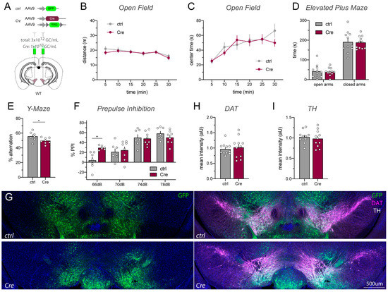 VTA injections of AAV9_Cre at lower titers do not alter behavioral or histological phenotypes. (A) Scheme visualizing bilateral injection of AAV9_Cre (1010 GC/mL) mixed with AAV9_DIO_GFP (2.99 × 1012 GC/mL; mixture hereafter simply denoted as Cre) and control AAV9_GFP (3.0 × 1012 GC/mL) into the VTA of adult WT C57BL/6J mice. (B,C) Distance traveled and center time spent in the open field task does not differ between Cre- and AAV9_GFP control-injected mice (n = 11/group; (B) two-way ANOVA, F(5,100) = 0.7684, p = 0.5747 and genotype: p = 0.5909; (C) mixed effects model, F(5,96) = 1.866, p = 0.1074 and genotype: p = 0.4474). (D) Anxiety assessed in the elevated plus maze is unaffected in Cre- and control-injected mice (n = 11/group; two-way ANOVA, F(1,20) = 0.00036, p = 0.9851 and genotype: p = 0.6528). (E) Spontaneous alternation measured in a Y-maze is slightly decreased in Cre- compared to control-injected mice (ctrl n = 7, Cre n = 8; unpaired t-test, p = 0.0442 *). (F) Sensorimotor gating is largely unaffected (ctrl n = 7, Cre n = 8; mixed effects model, F(2.184, 26.93) = 43.11, genotype: p = 0.5549, 66dB p = 0.0243 * (exclusion of two Cre values (~−30%) at 66 dB in outlier test, otherwise data would be non-significant). (G) Immunohistochemistry revealed normal histology in Cre-injected mice. (H,I) DAT and TH expression are comparable between Cre- and control-injected mice. Scale bars 500 µm.