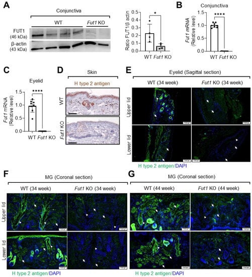 Loss of FUT1 and fucosylated products in the skin, conjunctiva, eyelid and MG in Fut1 KO mice vs. WT mice. (A) Representative Western blot image and quantitative densitometric analysis of FUT1 and β actin in the conjunctiva in WT and Fut11 KO mice. (B,C) Real-time RT-PCR for the Fut1 gene in the conjunctiva (B) and eyelid (C). The mRNA levels in Fut1 KO mice are presented as fold changes relative to those in WT mice. (D) Immunostaining of H type 2 antigen in the skin in WT and Fut1 KO mice. Scale bar: 50 μm. (E–G) Immunofluorescence staining of H type 2 antigen in the eyelid (E, sagittal section) and in MG (F,G, coronal section) in 34- and 44-week-old WT and Fut1 KO mice. The white arrows and arrowheads indicate the acinar and ductal epithelial cells of MG, respectively. Mean values ± SD are presented, where each dot represents the data from an individual mouse. * p < 0.05, **** p < 0.0001, as analyzed by unpaired t-test.