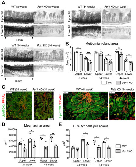 Similar observations were made with the acinar area of MGs and the number of meibocytes. LipidTOX and PPARγ were used as markers for MG acini and meibocytes, respectively [15]. Immunofluorescence staining showed that both the mean acinar area (marked by LipidTOX) and the meibocyte number (marked by PPARγ) were significantly decreased in the upper and lower eyelids in Fut1 KO mice, compared to their counterparts in WT mice at both 34 and 44 weeks of age (Figure 2C–E).