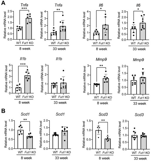 Expression of inflammation- and meibocyte-differentiation-related markers in the eyelid of FUT1 KO mice vs. WT mice. (A) Real-time RT-PCR for pro-inflammatory cytokines (TNF-α, IL-1β and IL-6) and enzyme (MMP9) in the eyelid of mice at 8 and 33 weeks of age. (B) Real-time RT-PCR for Scd1 (a marker for pre-sebocytes) and Scd3 (a marker for mature sebocytes) in the eyelid of mice at 8 and 33 weeks of age. The mRNA levels in Fut1 KO mice are presented as fold changes relative to those in WT mice (mean values ± SD). Each dot represents the data from an individual mouse. * p < 0.05, ** p < 0.01, *** p < 0.001, as analyzed by unpaired t-test or Mann–Whitney U test.