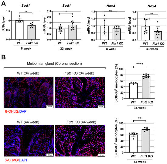 Expression of oxidative-stress-related markers in the eyelid of Fut1 KO mice vs. WT mice. (A) Real-time RT-PCR analysis for an antioxidant gene Sod1 and an oxidative-stress-related gene Nox4 in the eyelid of Fut1 KO and WT mice at 8 and 33 weeks of age. Shown are the mRNA levels in Fut1 KO mice relative to those in WT mice (mean values ± SD). A dot represents the data from a single individual animal. (B) Representative 8-OHdG immunostaining image of MG coronal sections and quantitative analysis of 8-OHdG+ meibocytes in WT vs. Fut1 KO mice at 34 and 44 weeks of age. Scale bar: 50 μm. Mean values ± SD are presented, where each dot represents the data from the upper or lower eyelid of a single individual animal. * p < 0.05, ** p < 0.01, **** p < 0.0001, ns: not significant, as analyzed by unpaired t-test or Mann–Whitney U test.
