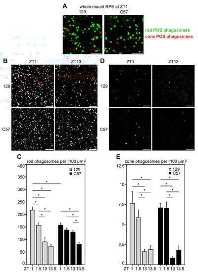We prepared whole-mount RPE samples at specific times after light and dark onset from age-matched 129 and C57 mice that were born, raised, and light-entrained under the same conditions. We sought to ensure that we would be able to directly compare time points with earlier studies by us and others. As our previous studies focused on ZT1 and the recent data on C57 mice tested at ZT1.5, we collected tissues both 1 and 1.5 h after light and after dark, respectively (ZT1, ZT1.5, ZT13, and ZT13.5). We co-stained RPE whole mounts with rhodopsin and cone opsin antibodies to allow for identification of both rod and cone POS phagosomes by immunofluorescence microscopy. Close-up observation of samples obtained at ZT1 and co-stained for rod and cone POS phagosomes, respectively, did not reveal obvious differences in overall size, appearance, or distribution of phagosomes (Figure 1A). To quantify phagosomes, we next imaged and analyzed low-magnification fields in order to represent a large portion of the RPE in the analyses. Representative images for rod phagosomes (Figure 1B) and resulting quantification revealed that rod POS phagocytosis peaks at ZT1 in 129 mice with significantly fewer rod POS phagosomes at ZT1.5 (Figure 1C, gray bars). At both time points after dark, we found significantly lower rod POS phagosome content in 129 mice than at either ZT1 or ZT1.5 (Figure 1C, gray bars). There was no difference in rod POS phagosome content at ZT13 and ZT13.5 in 129 mice. In C57 mice, rod POS phagosome content was the same at ZT1, ZT1.5, and ZT13 and significantly less than any of these only at ZT13.5 (Figure 1C, black bars). Unlike in 129 mice, rod POS phagosome content at ZT1 was not significantly different from ZT1.5 in C57 mice. Comparing rod phagosome content between strains at the same time point, the rod POS phagosome content at ZT1 was significantly higher in 129 than in C57 mice (Figure 1C, gray and black bars, ZT1). Next, we quantified cone POS phagosome content in the RPE at the same time points. We found no difference between 129 and C57 RPE in cone POS phagosomes regardless of the time point tested (Figure 1D,E). Cone POS phagosome content was elevated in both strains shortly after light onset, at ZT1 and ZT1.5, as compared to shortly after dark, and there was no difference between ZT1 and ZT1.5 or ZT13 and ZT13.5, respectively (Figure 1D,E). Finally, it should be noted that the morphology of the RPE as well as the distribution of rod and cone POS phagosomes across retinal regions was indistinguishable between the two strains.