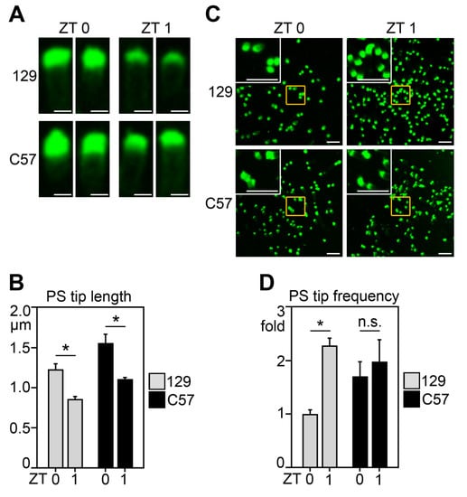 The rod POS phagosome content analyses above suggest an attenuated burst of RPE phagocytic activity toward rod POS after morning light onset in C57 mice compared to 129 mice. We wondered if this was reflected in differences in exposure of the PS “eat me” signal exposed by photoreceptor tips, which precedes the morning peak of RPE phagocytosis []. Previously, we showed that in 129 mice, PS tips elongate by ZT0 and show maximal frequency across the retina at ZT1 [,]. Here, we thus directly compared the length of PS-marked outer segment tips and frequency of PS-exposing outer segment tips in both 129 and C57 retina in the morning at ZT0 and ZT1. We found that the average length of PS exposure at individual outer segments was significantly higher at ZT0 than at ZT1 in both 129 and C57 retina, matching our previous studies (Figure 2A,B, compare ZT0 and ZT1 gray bars and black bars, respectively). Thus, individual rod photoreceptors in C57 retina respond to anticipated light onset like those in 129 retina, by elongating their PS-exposing tips. Moreover, PS-exposing outer segment tips were significantly longer at ZT1 in C57 than in 129 retina (Figure 2B, compare gray to black bars at ZT1 and at ZT1.5, respectively). With respect to frequency of rods with PS tips exposing PS, we imaged low-magnification fields (Figure 2C). Insets with white borders in the upper left-hand corner of each panel show enlargements of areas indicated by yellow squares in each field. These illustrate that overall, the appearance of PS tip labeling was similar among strains. Quantification showed that the abundance of PS-exposing outer segment tips in 129 retina more than doubled between ZT0 and ZT1, in agreement with our previous studies (Figure 2C,D, gray bars). In contrast, there was no change in frequency of rods with PS-exposing tips in C57 retina in this time period (Figure 2C,D, black bars). The average frequency of PS-exposing outer segment tips in C57 retina was in between the low average at ZT0 and the high average at ZT1 in 129 mice, but differences between strains did not reach statistical significance.