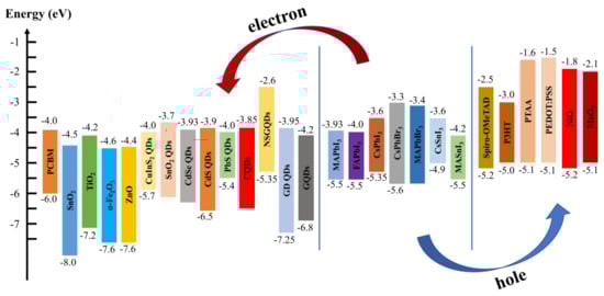 Energy level diagrams of various QDs applied in PSCs.