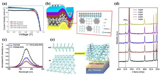 (a) J-V curves for forward and reverse scanning. Reproduced from [], with permission from Elsevier, 2019. (b) AGQDs optimize NiOx []. (c) Steady-state photoluminescence spectra. Reproduced from [], with permission from the American Chemical Society, 2020. (d) XRD pattern shows the presence of PbI2 diffraction peaks. Reproduced from [], with permission from Elsevier, 2019. (e) P3HT modified with graphdiyne. Reproduced from [], with permission from Wiley, 2015.