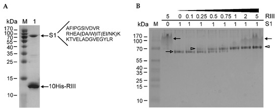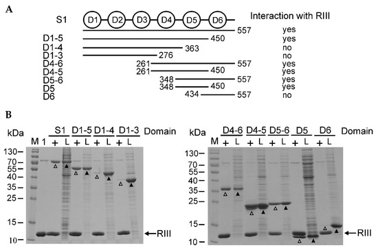 To determine which S1 domains are the targets for RIII binding, we constructed eight recombinant plasmids for the overexpression of different truncated versions of S1 (Tables S1 and S2). The schematic representation of the domains of the entire protein S1, as well as its truncated versions induced from the expression plasmids, is shown in Figure 2A.