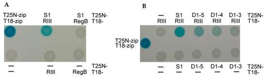 As expected, no protein–protein interaction was observed (white spots) when combining the plasmids encoding the adenylate cyclase fusions with RegB and S1 (Figure 3A). This confirmed the previously proposed hypothesis that the activation of RegB nuclease by S1 does not depend on direct interaction between these proteins [53]. Meanwhile, this assay confirmed an in vivo RIII–S1 interaction (blue spots) (Figure 3).