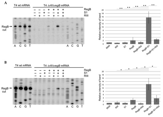 The total RNA isolated from E. coli cells infected with T4 ∆rIII∆regB was used as a source of RegB substrates in seven in vitro reaction mixtures as follows: (i) only total RNA in the reaction buffer; (ii) RNA + RIII; (iii) RNA + S1; (iv) RNA + RegB; (v) RNA + RegB + RIII; (vi) RNA + RegB + S1; and (vii) RNA + RegB + S1 + RIII. The products of these reactions were then analyzed by primer extension using the 5′-P32-labeled primers No. 35 and No. 36 (Table S1), complementary to the T4 early transcripts motA [54] and 30.7 [55], respectively, as they were known to have RegB cleavage sites. The representative images showing RegB activity toward the T4 ∆rIII∆regB early transcripts motA (A) and 30.7 (B) in different mixtures are presented in Figure 4.