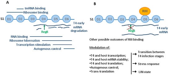 In this study, we confirm that in vivo RegB and S1 proteins do not interact directly, as it was predicted previously [53]. Meanwhile, we detected that S1 interacted with the T4 protein RIII and this interaction prevented RNase RegB from activation by S1 in vitro (Figure 4 and Figure S4). Since the stimulation of RegB is thought to be mediated by the RNA-binding function of S1, we speculate that RIII binding prevents the C-terminal domains of S1 from mRNA binding. A similar effect has been observed in the Pseudomonas aeruginosa giant phage phiKZ, where the phage-encoded effector protein Dip occluded the RNA-binding sites of the host RNase E leading to the inhibition of its activity [67]. Although the regulation of the host ribosomal proteins by viral factors is common between viruses [8], to our knowledge, RIII is the first identified effector protein of T4 targeting S1 and the first one affecting ribosomal proteins at all. Taking into account that S1 in E. coli plays many different roles and binds very different RNAs, the function of the S1–RIII interaction in T4-infected cells may not be restricted to the functional inactivation or regulation of RegB. In fact, RIII may modulate the expression regulation of many host and phage genes. To better understand all the possible outcomes of the S1–RIII interaction, we would like to briefly comment on the key points of the T4 life cycle that may be targeted by this interaction.