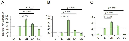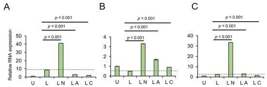 The effect of LPS-Az and LPS-Cf on RNA levels of NLRP3 associated genes in PC3 cells. (A) NLRP3, (B) Pro-CASP1, (C) Pro-IL-1β. U: Untreated, L: LPS, LN: LPS-Ng, LA: LPS-Az, LC: LPS-Cf. p values were calculated using one-way ANOVA and Tukey’s post-hoc tests (n = 3). Dotted line indicates RNA expression in LPS primed PC3 cells. Data is presented as Mean ± SD.